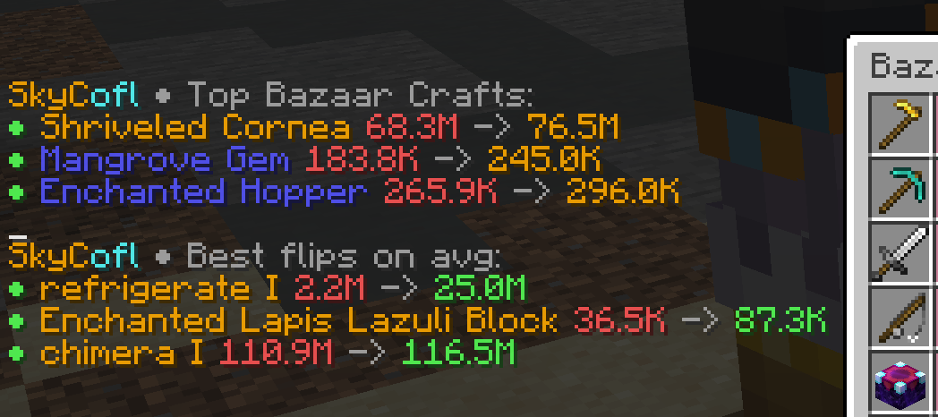 ➡️ Added /cofl set nocookie true to switch the top bazaar flips to use the bazaar search instead of the command, so you can click the crafts and get redirected to the correct page even without a cookie.