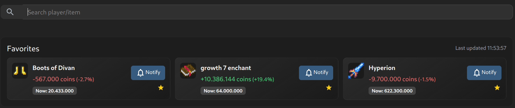 ➡️ Added Favourite Item system to the website. It allows you to quickly pin items to the main page to access them more easily. Also current price and 24 hour price change is shown directly.