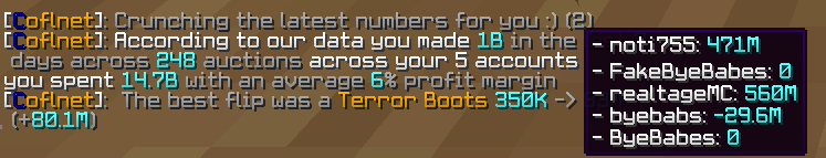 ➡️ Added per account profit breakdown to /cofl profit as suggested by @spiritofthewars. Thanks for the image @byebabes