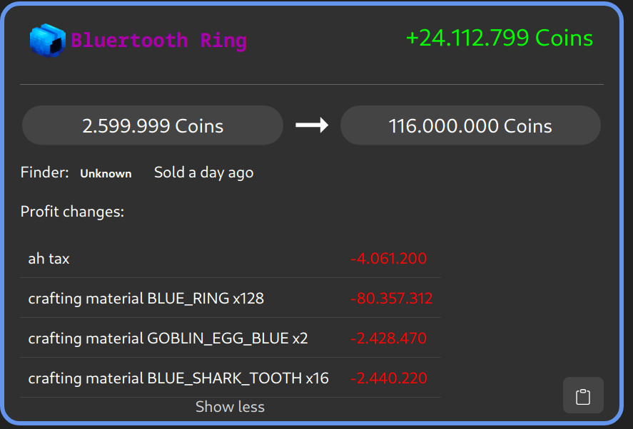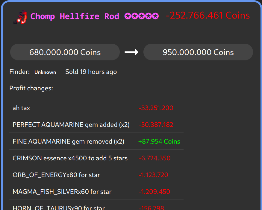 ➡️ Fixed auction indexing after the new fishing rods broke it. All auctions should now show up on the website again. As usual if you notice wrongly tracked flips please run /cofl loadfliphistory to have the recalculated.