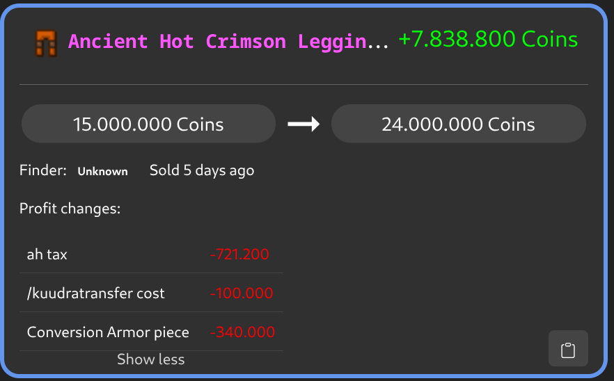 ➡️ /cofl lb now also refreshes displayed scores after each view. Not only when viewing tracked flips. As it takes some time it’s done in the background instead of letting you wait. As suggested by @birch0